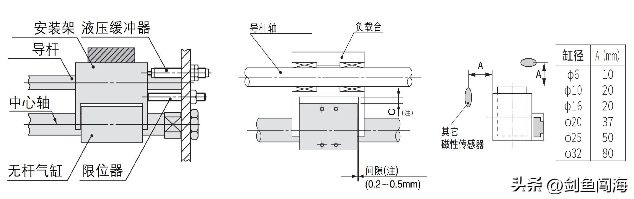 用外部限位器使负载中途停止的场合,使用压力不能超过约0.55MPa,使用压力一旦超过界限值,磁耦有脱离的可能性。用气动回路使负载在行程中途停止的场合,动能一旦超过允许值,磁耦有脱离的可能性。标准版磁耦无杆气缸的滑块能够旋转,需要增加外边导向来防止旋转。磁耦无杆缸在垂直安装场合,有安全风险。应该尽量避免固定无杆气缸滑块的情况下使用,而应该使用气缸端板固定。气缸的安装面的平面度应在0.2mm以下,安装时全行程以最低动作压力 (0.18MPa以下)可平滑动作来测试。否则会使得滑动阻力增大,轴承部过早磨耗,寿命降低。直接连接负载和气缸滑块时,无法吸收各自的轴心偏心,进入施加横向负荷的状态,导致动作不良。为了可吸收偏心及气缸的自重挠曲,考虑使用浮动连接方法。(下左图)在行程末端,负载被停止时有可能发生缸体倾斜,使轴承及缸筒受损伤。故,限位器与液压缓冲器并用,且从缸体中部的传递推力,便不会发生缸体的倾斜。(下左图)气缸水平安装场合,由于自重产生的下弯量,行程越长,轴中心的下弯量越大。因此浮动连接机构应该留有相应的间隙。(下中图)由于磁耦无杆气缸利用磁力耦合,会磁化气缸附近铁板等磁性体,导致磁性开关的误动作。因此应该让铁板等磁性体与磁性开关空开4mm以上的距离。与其它气缸邻接使用或在附近使用其它磁性传感器时,为了防止因无杆气缸内部磁环的漏磁而发生误动作,适宜将从滑块表面到其它磁性传感器的距离控制在(下右图数值以上)。如果做不到在该数值以下,可通过将2mm厚铁板夹在与滑块的间隙中,可防止误动作。
