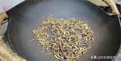 找一口干净的无水无油的铁锅,放入阴干的蒲公英叶子,开小火慢慢炒制。期间用筷子将蒲公英叶子不停地拨散开、翻面,也可以直接用手来操作,把叶片不停地抖散开、翻面。重复这样的操作,直到叶片完全炒干。