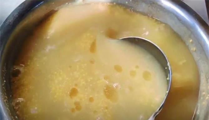 3、半小时后,倒水沥干,将小米洗净,起锅烧水,然后煮小米粥。不管味道好不好,烹饪步骤很重要。首先要等水烧开才可以加入小米,这样做出来的小米粥非常粘稠,而且还产生了米油。用勺子搅拌一下,防止粘在锅底。不要忘记用凉水在锅里煮小米粥,否则就达到了少水清汤的效果。很容易粘锅底。锅烧开后,保持中火至中火煮约15分钟。中间加入适量的食用碱粉,可以让煮好的小米糊更加粘稠。记住这个小技巧。