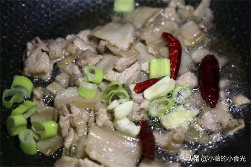 3、 猪肉切薄片,最好带些肥肉的五花肉炒着才香。葱切葱花,蒜拍碎切小粒。