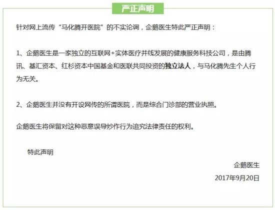 “这其实是个谣言,被网上一些别有用心的人拿来炒作,其实我们做的是线下诊所,却被等同于了医院。另外这根本不是马化腾的个人行为。”企鹅医生一位内部人员表示。