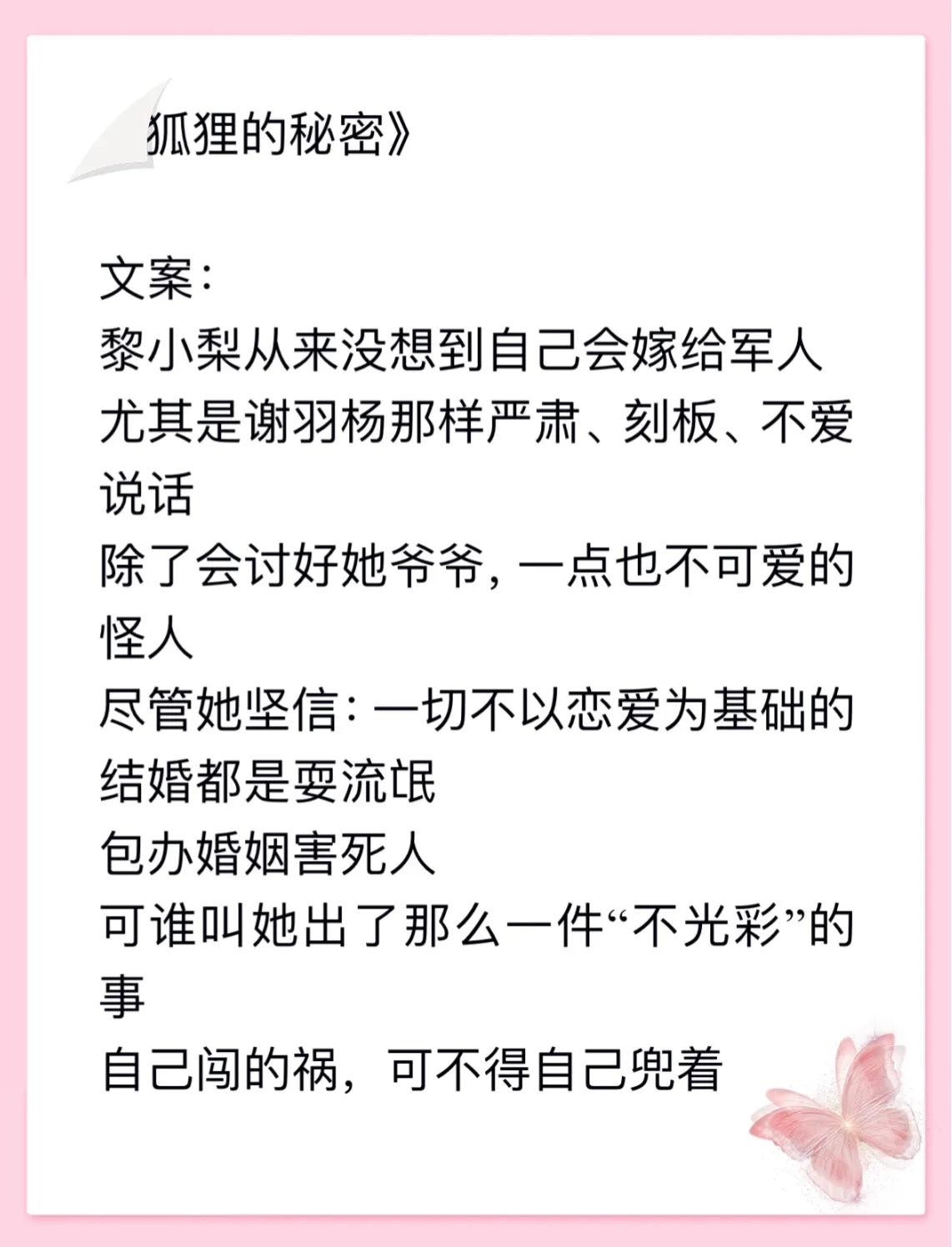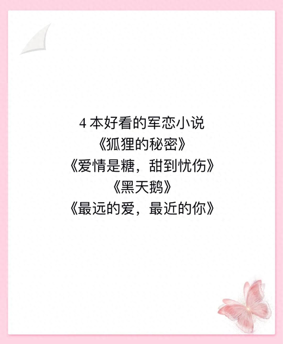 4本军恋高干小说推荐给大家,都是颜月溪的作品,很不错,喜欢看高干背景、军恋小说的小伙伴们不要错过哦!四本小说分别是《狐狸的秘密》、《爱情是糖,甜到忧伤》、《黑天鹅》、《最远的爱,最近的你》,这四本也是系列文,男主都是认识的。我最喜欢的是后两部,有和我一样的小伙伴吗?