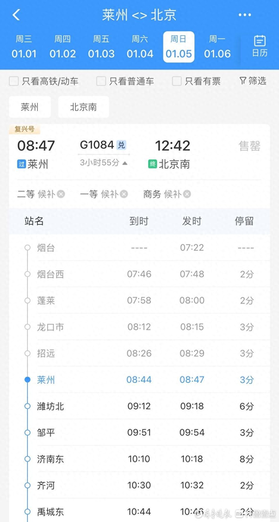 2025年1月5日零时起,全国铁路将实行新的列车运行图,新图车票已于2024年12月22日起陆续发售。查询铁路12306发现,2025年1月5日起,潍烟高铁开通烟台至北京的直达列车,其中,乘坐G1084次列车,从莱州站至北京南站途经8站,全程只需要3小时55分。