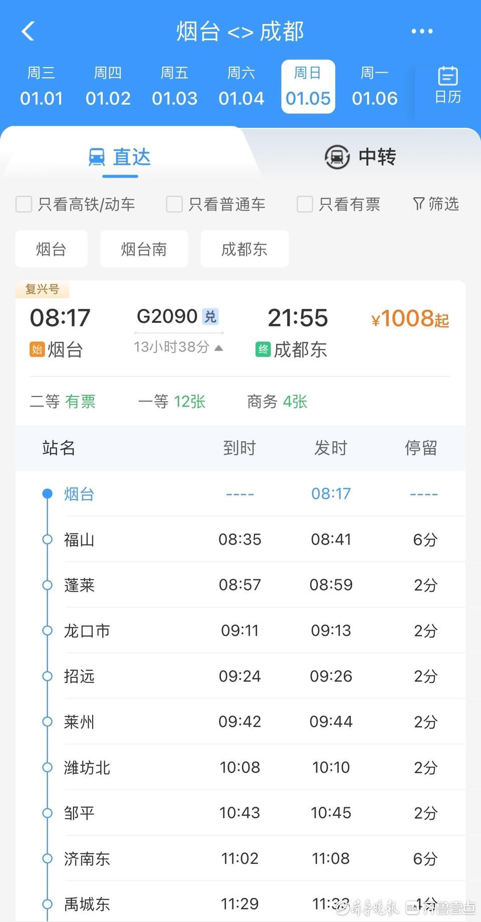 同时,2025年1月5日起,潍烟高铁也开通了从烟台至沈阳、成都等热门城市车次。其中,截至2024年12月23日12点,2025年1月5日G2090次列车龙口市-成都东二等座车票仅剩12张,莱州-成都东车票已售罄。