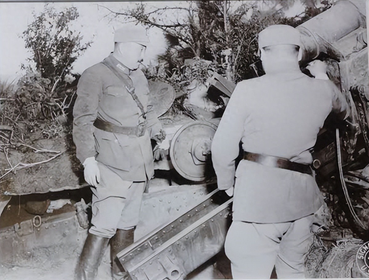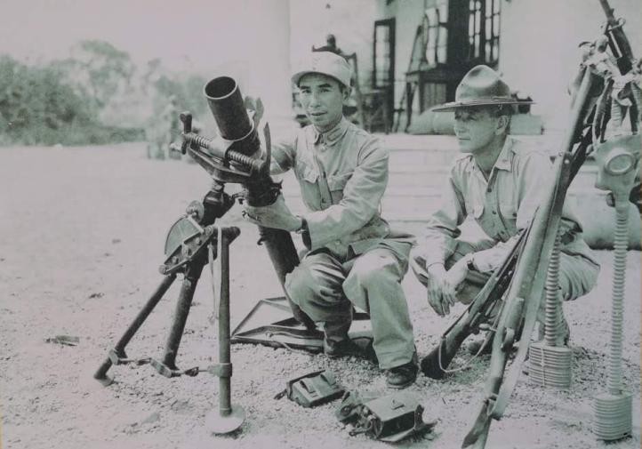图为中国远征军司令卫立煌将军在前线检查一门150毫米的榴弹炮。卫立煌于1942年3月被任命为远征军司令长官。但是,他在重庆待命期间被人告发,被撤销了司令长官之职,改由罗卓英代替。1943年远征军作战失利,又重新启用卫立煌,担任中国远征军司令长官。