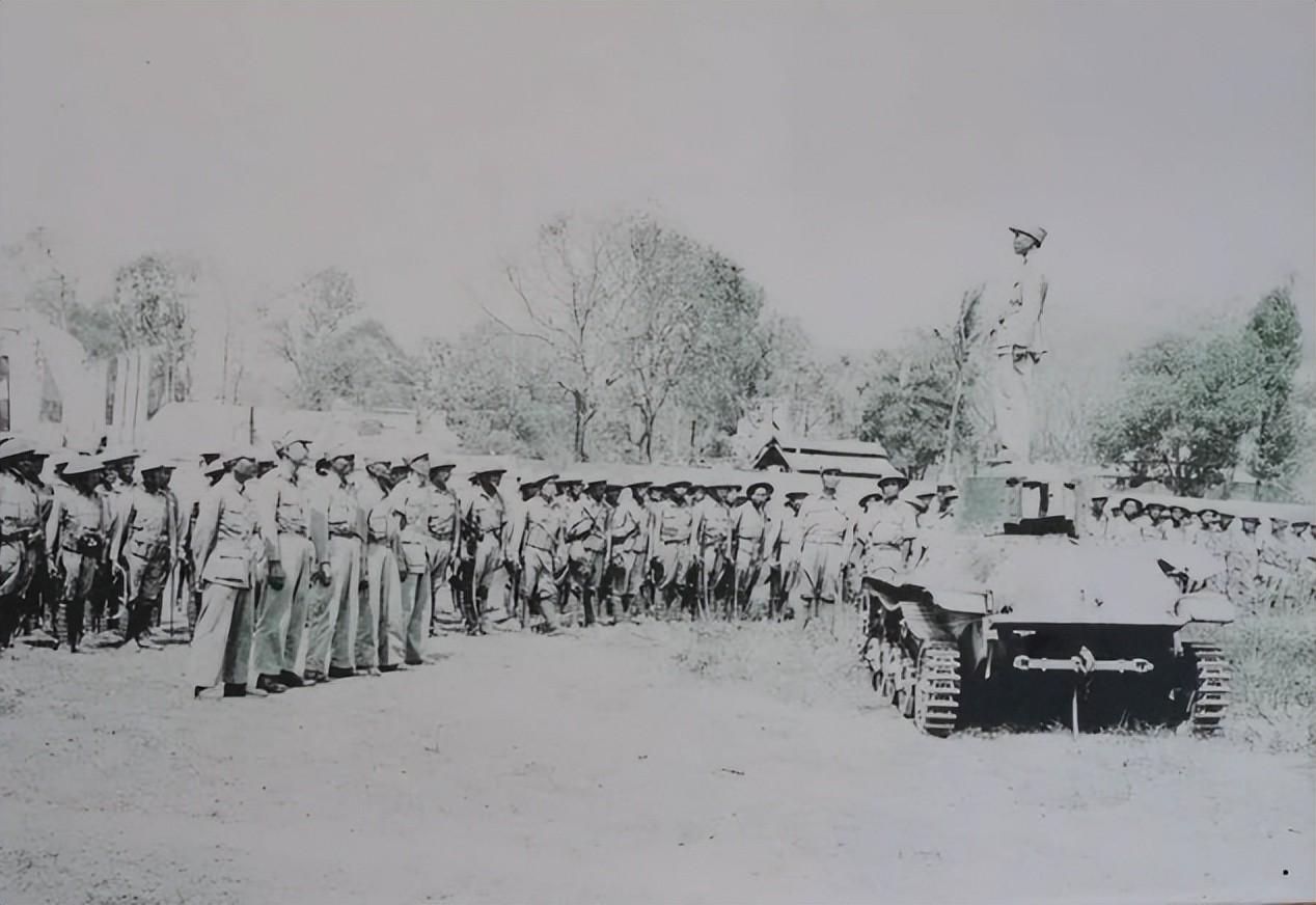 第50师师长潘裕昆将军站在一辆缴获的日军坦克上发表演讲。潘裕昆生于1906年,湖南人。曾参加过淞沪会战,抗日战争中,他英勇善战、身先士卒,屡建战功。从照片上看,远征军们士气高昂,状态很好。