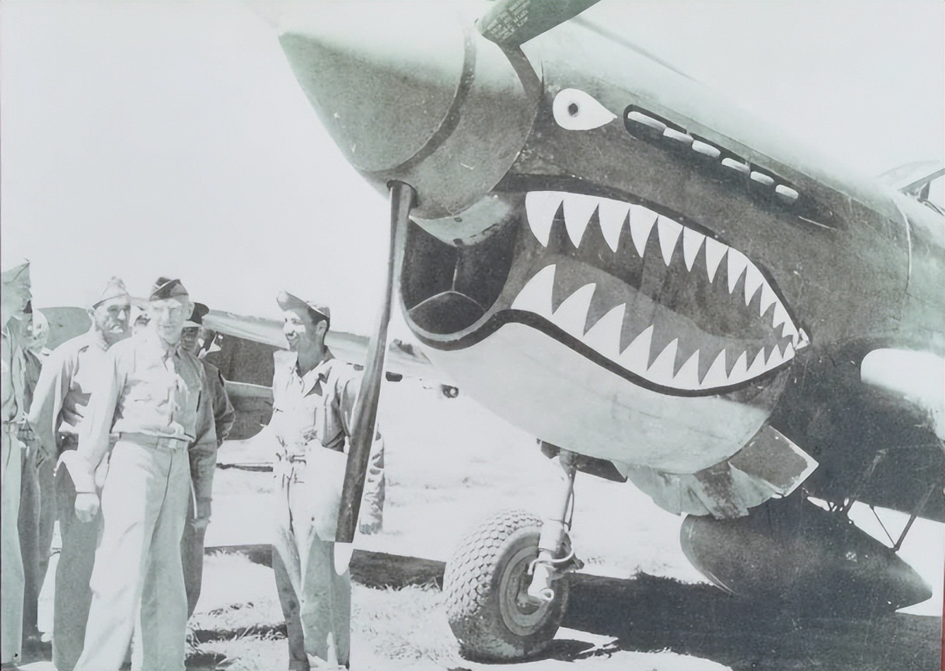 史迪威将军(中立者,戴眼镜)站在P-40战斗机前。站在史迪威将军右侧后方的是第14航空队指挥官陈纳德将军。他们身旁画着大白牙的战斗机格外惹人注意。