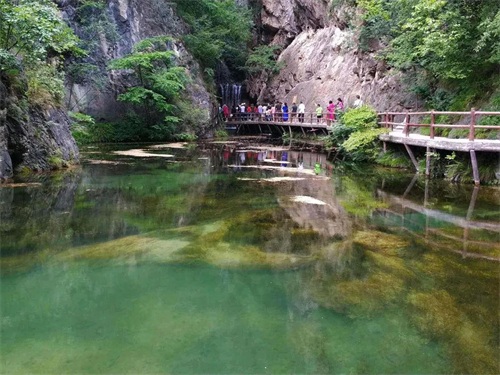 这里有一个非常美的景点,叫作桃花谷,桃花谷游览区是双龙湾景区中的核心游览区,从谷口到谷底,一路上形成了无数大小不等的瀑布,形成了一个秀美的千层叠瀑,因为这里有很多瀑布,走进桃花谷,大大小小的瀑布让人有种置身于九寨沟的感觉,因此也被称为“北方的小九寨”。这里的瀑布还被称为迎宾瀑,每天都在这里迎接着万千八方的游客。