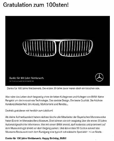 “感谢100年来的竞争,没有你的那30年其实感觉很无聊。”(奔驰比宝马早成立30周年)