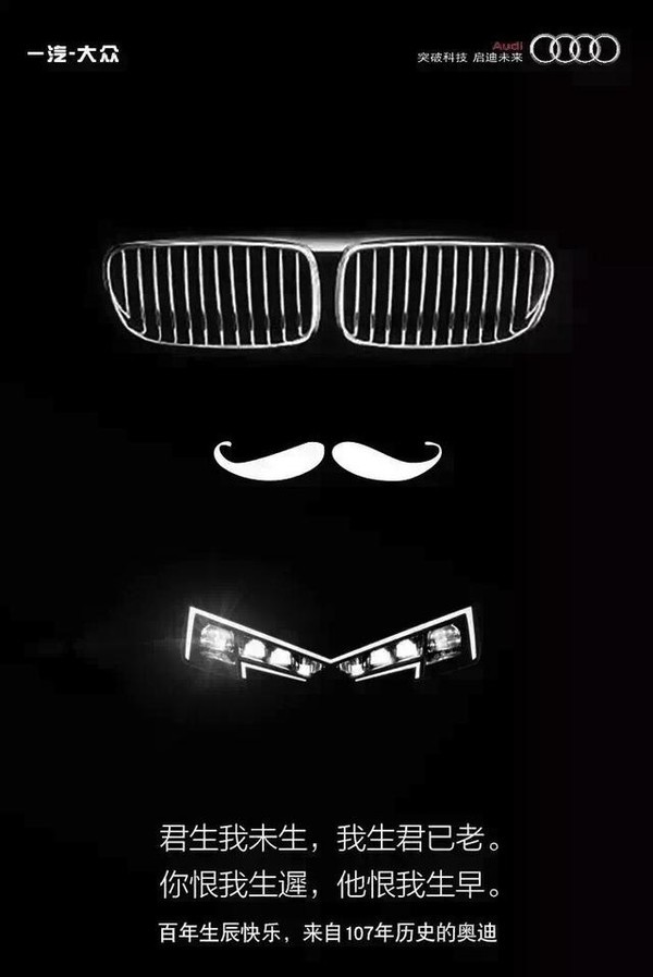 奔驰和宝马是一对好基友,两个品牌之间互撕的故事很多,互损的同时也带着基友的幽默。不过它们经常不带上奥迪,于是奥迪也强行凑热闹,网上传出一张疑似来自奥迪的海报:百年生辰快乐,来自107年历史的奥迪。