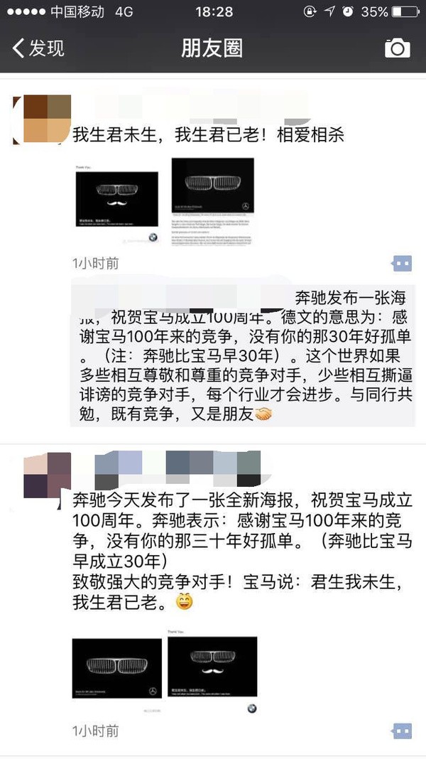 3月6日奔驰在FaceBook和推特账号上,发出了一条推文:贺宝马100岁生日。