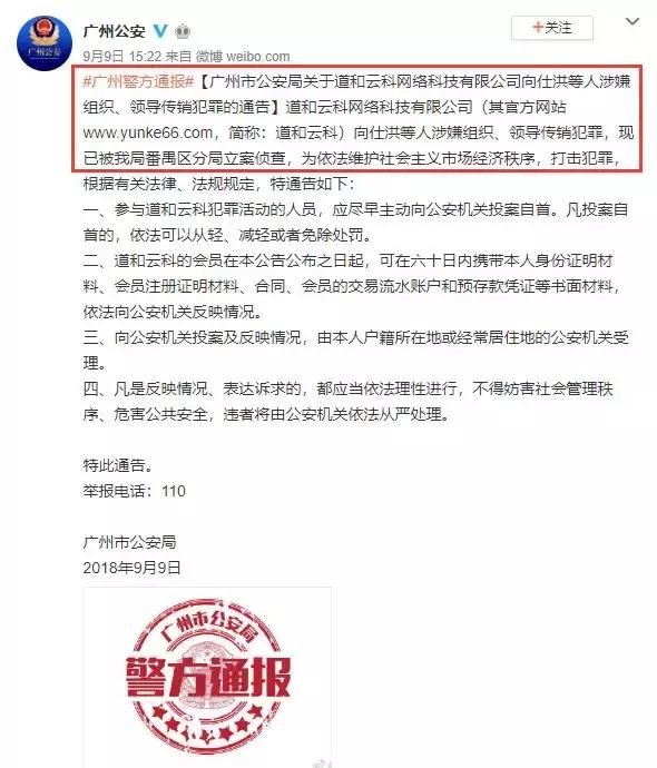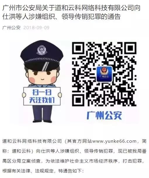9月9日下午,广州市公安局微博和微信公众号发布关于道和云科网络科技有限公司向仕洪等人涉嫌组织、领导传销犯罪的通告:道和云科网络科技有限公司向仕洪等人涉嫌组织、领导传销犯罪,现已被我局番禺区分局立案侦查。