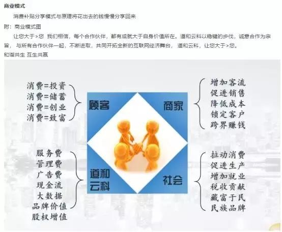 道和云科官网显示,其商业模式为:消费补贴分享模式与原理将花出去的钱慢慢分享回来。其实内容和“云联惠”的消费返利的套路一模一样。