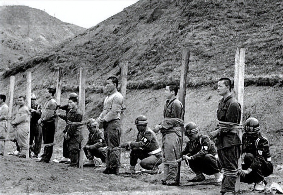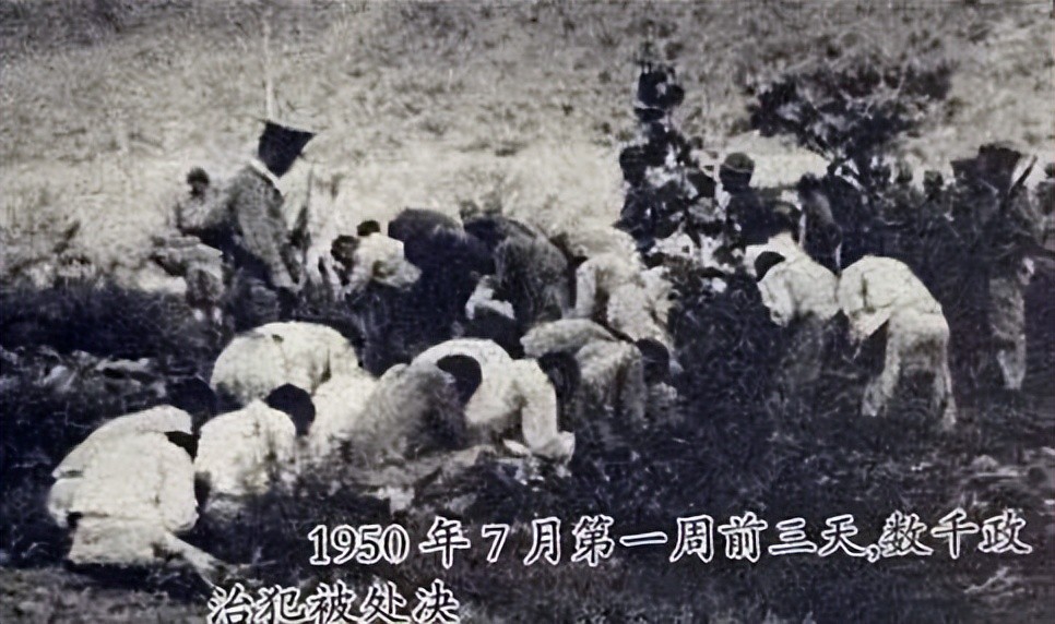 在山谷之中,每个犯人都身穿白衣,他们的双手被铁丝捆在身后。犯人们低头弯腰,面朝着土坑等待着自己的宿命。韩国军人和警察,成排地站在犯人们身后,开始朝着犯人的后脑射击。犯人被击毙后,尸体栽倒在挖好的土坑中。