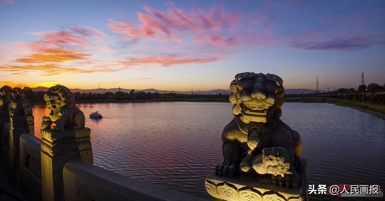 2014年9月8日,太阳西下,晚霞映照在永定河,卢沟桥的石狮也披上了霞光。摄影 邹毅/人民画报
