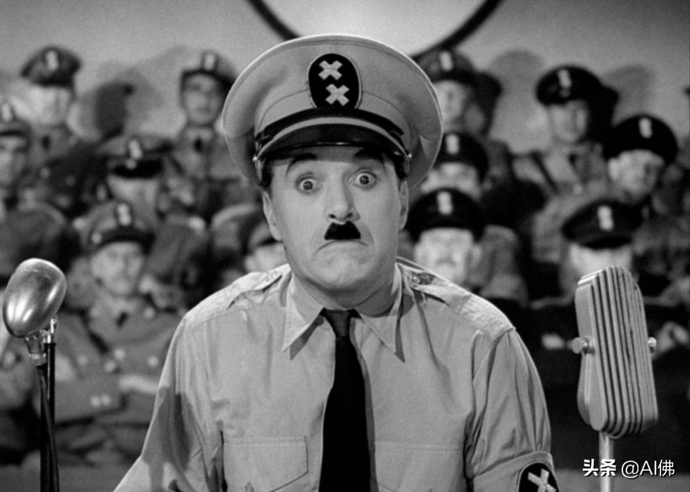 卓别林的《大独裁者》于 1940 年上映,是他第一张完全会说话的影片。在对阿道夫希特勒和纳粹主义的模仿中,卓别林扮演了两个角色——犹太理发师和法西斯领导人 Adenoid Hynkel——并对这位德国领导人进行了严厉的批评。它被提名奥斯卡最佳男主角和最佳影片奖。