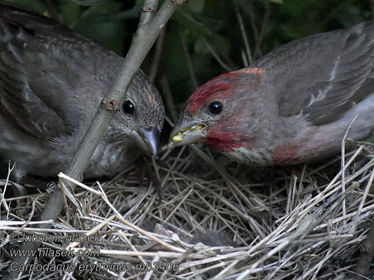 国外拍摄的麻料共同育雏的场景,红色为公,青色为母