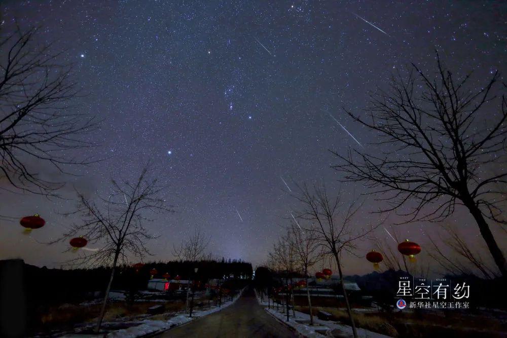 北京市海淀区中关村第二小学天文教师朱戈雅 2015 年 12 月 14 日在北京房山花台风景区拍摄的双子座流星雨(多张叠加)。(本人供图)