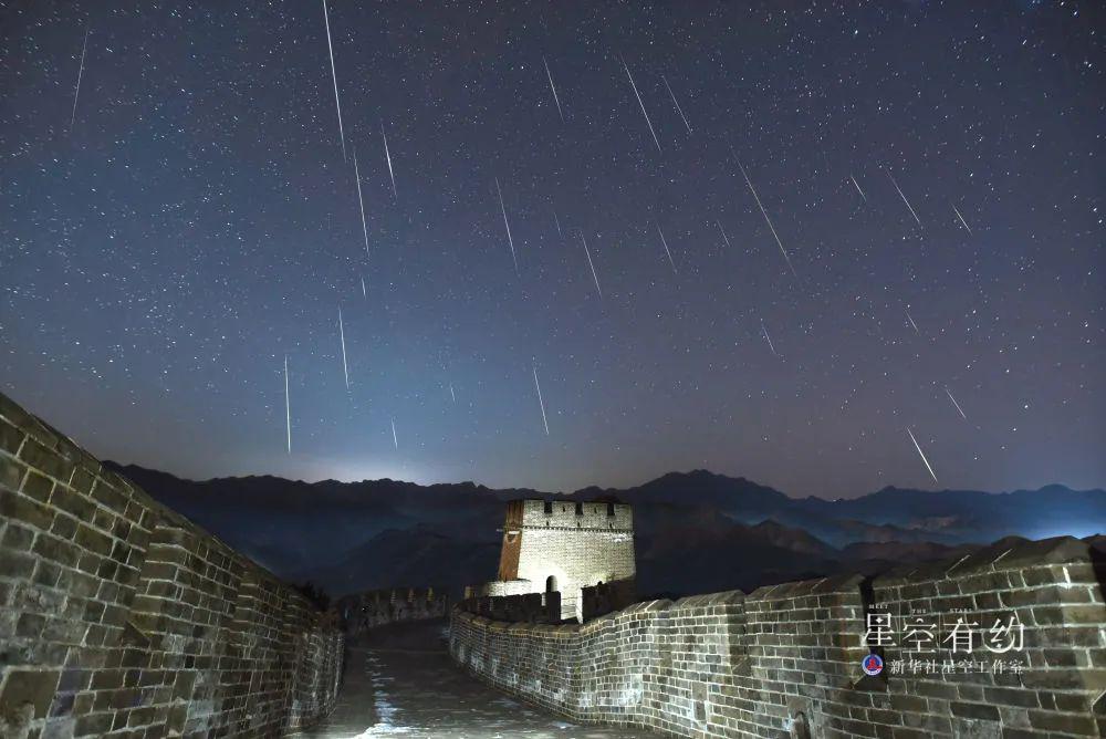 中国天文学会会员、天津市天文学会理事杨婧 2021 年 12 月 14 日在天津市蓟州区黄崖关长城拍摄的双子座流星雨(多张叠加)。(本人供图)
