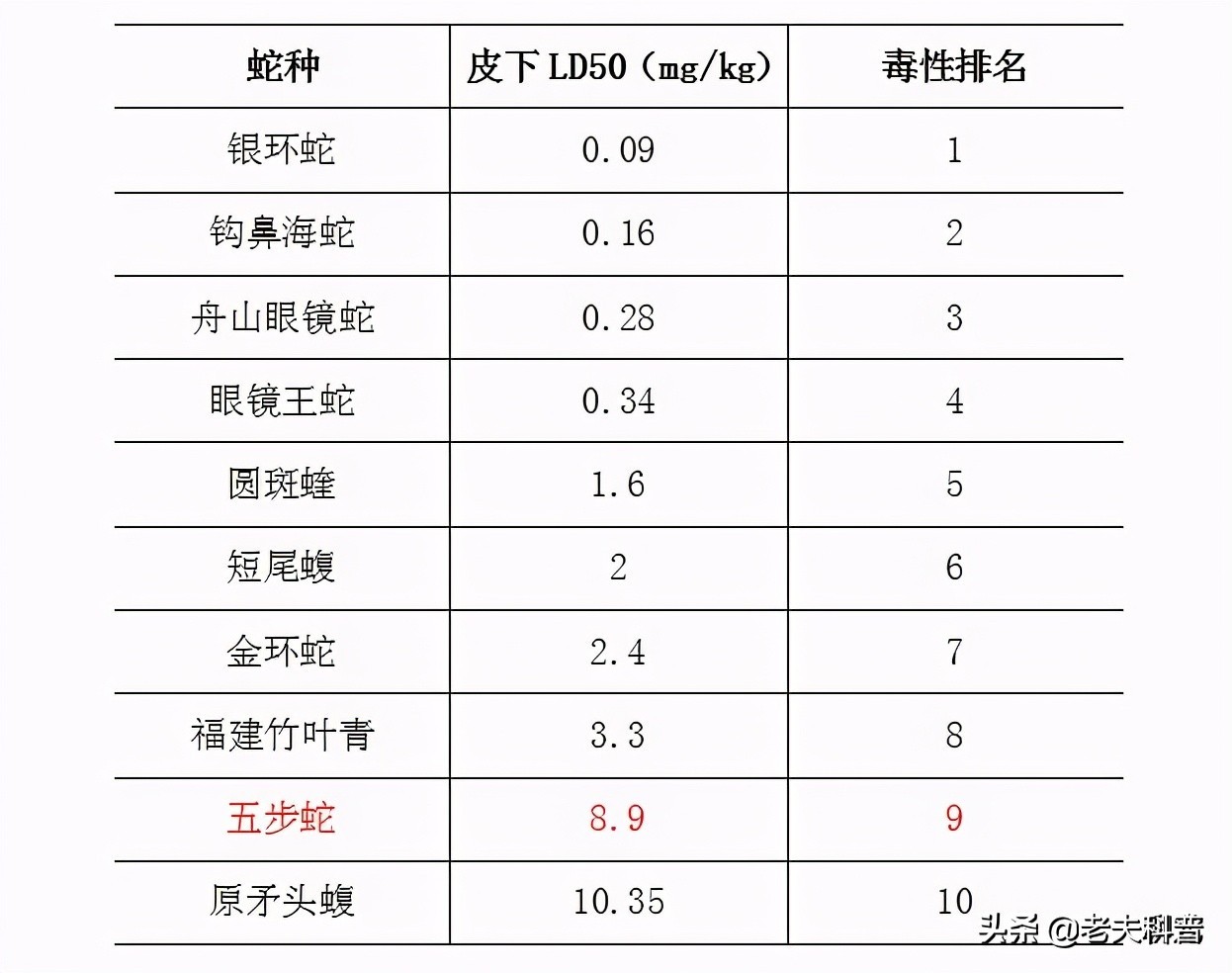 经过研究人员的小鼠实验,测得对一批小鼠皮下注射五步蛇毒液的半数致死量也就是LD50数值为8.9mg/kg,这个数据在毒蛇界并不算太高,同国内毒性第一的银环蛇皮下LD50数据0.09mg/kg相比,二者毒性相差近百倍。(LD50数值越小,毒性越强。)