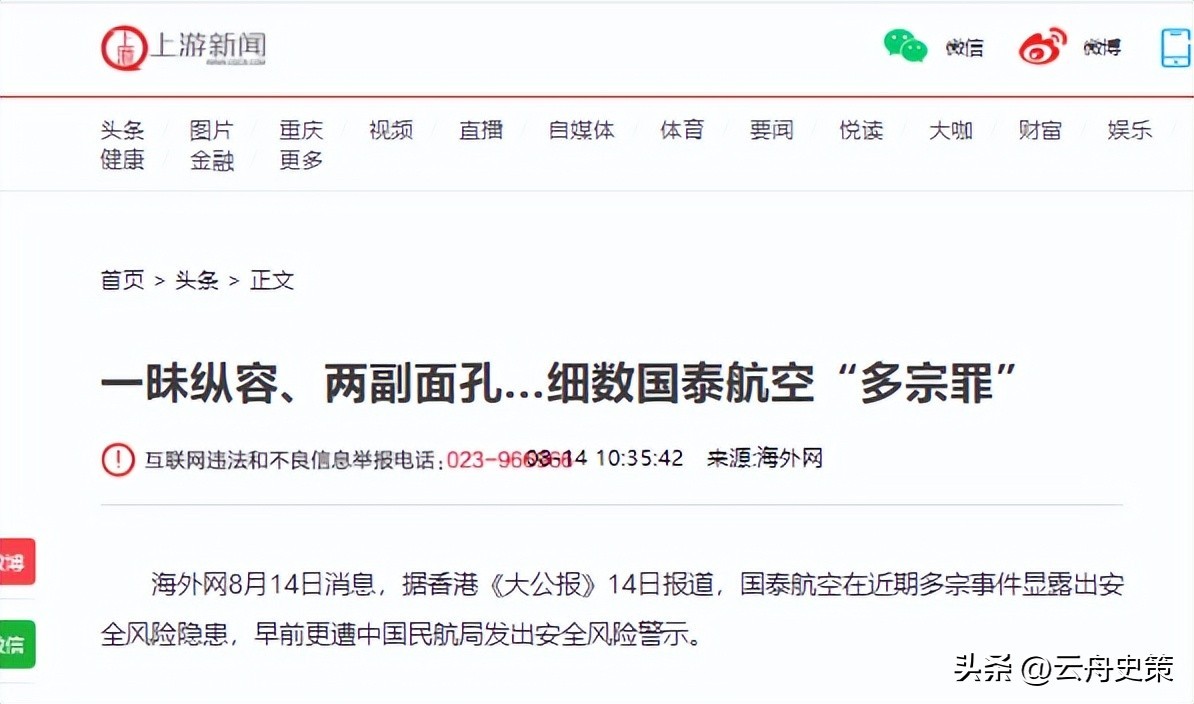 海外网-上游新闻《一昧纵容、两副面孔…细数国泰航空“多宗罪”》