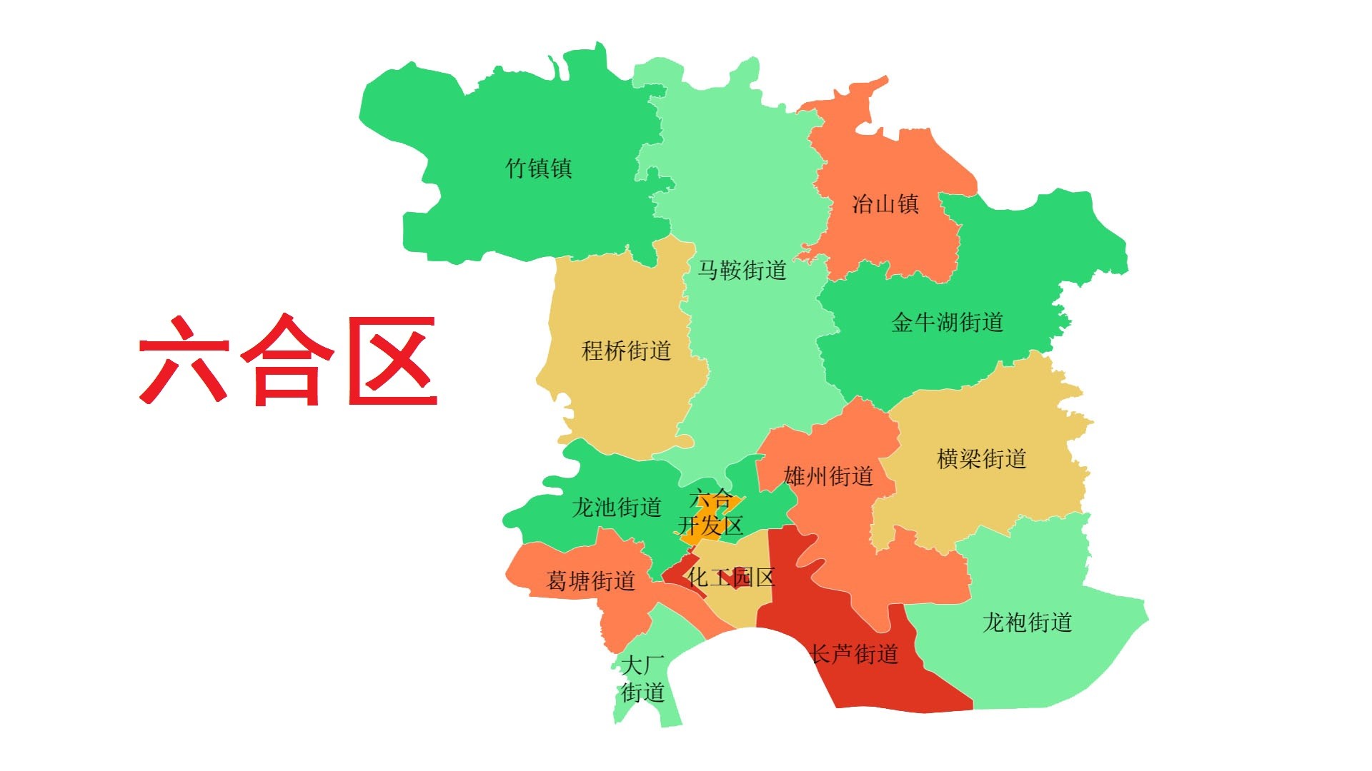 六合区总面积1471平方千米,下辖11个街道(雄州街道、龙池街道、程桥街道、大厂街道、葛塘街道、长芦街道、金牛湖街道、横梁街道、龙袍街道、马鞍街道、冶山街道)、1个镇(竹镇镇)。截止2022年末,六合区常住人口63.64万人。