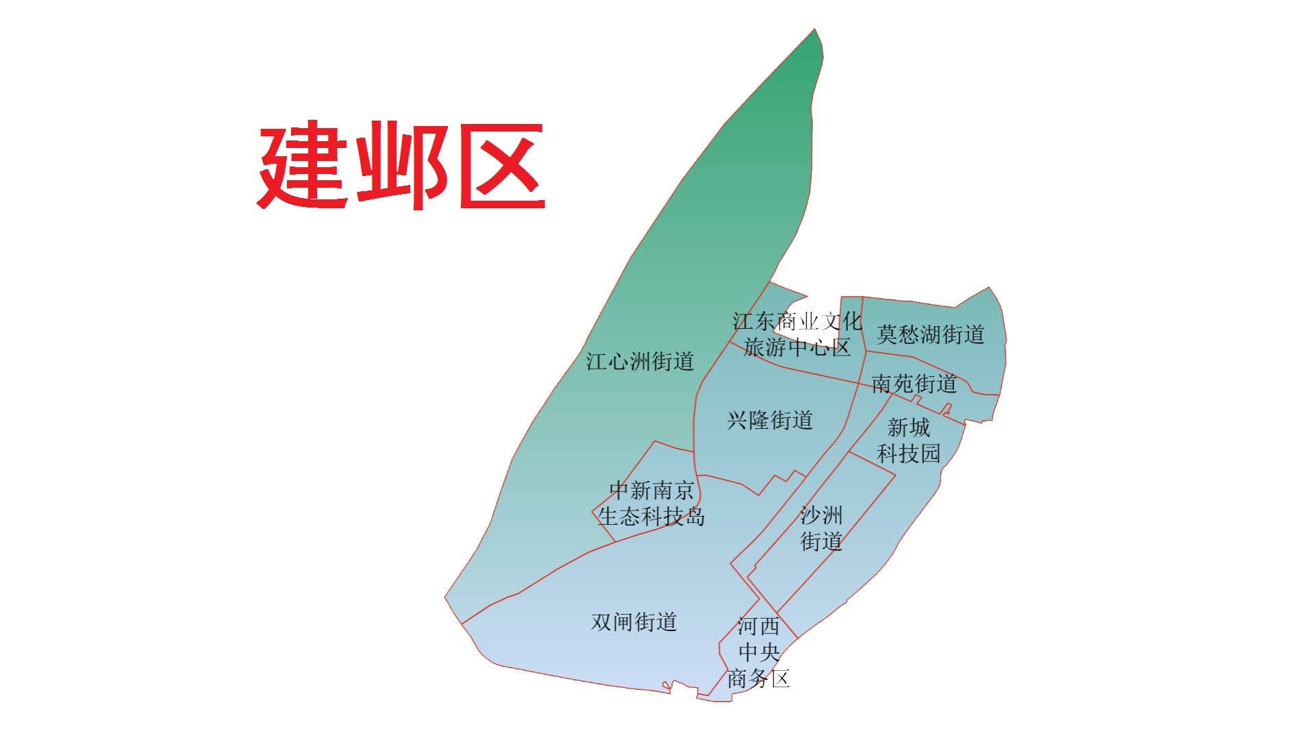建邺区,区政府驻沙洲街道。位于南京市域中部(主城区西部),区境东临秦淮区,东南、南连雨花台区,西与浦口区隔江相望,北接鼓楼区。