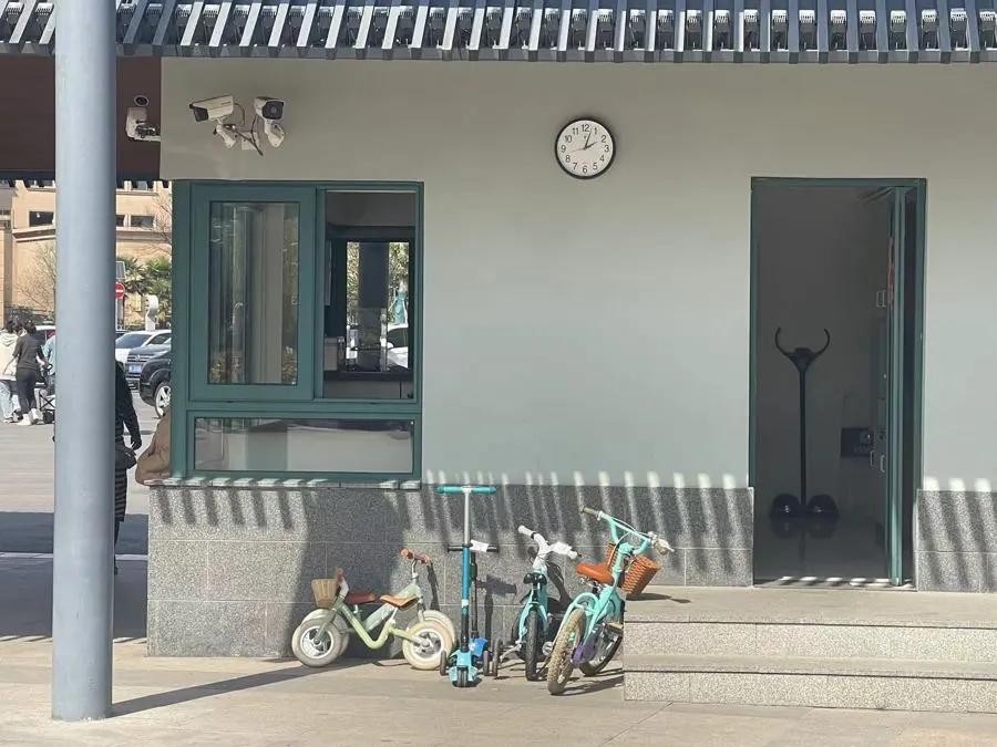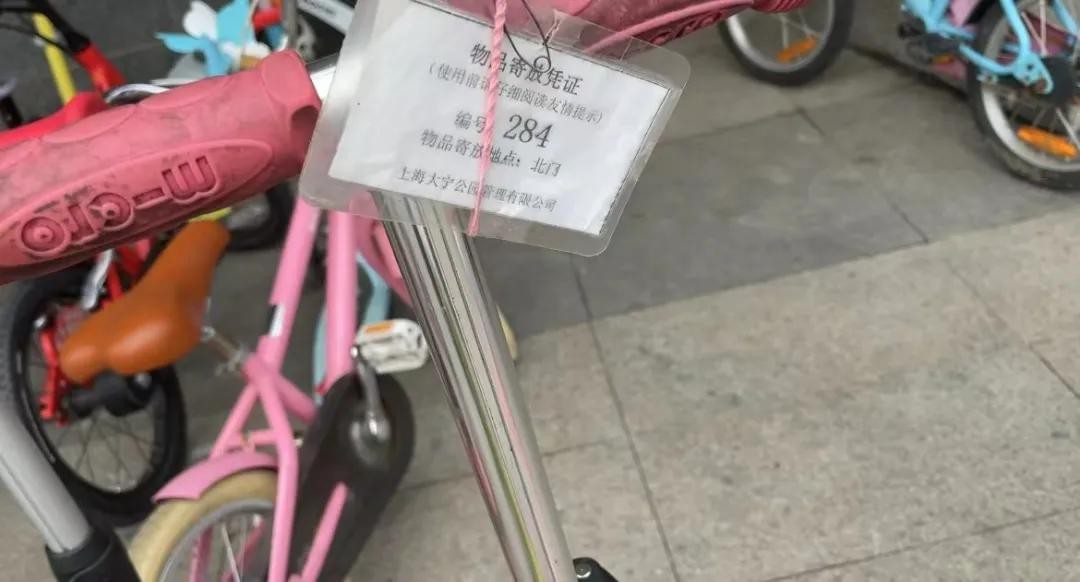 公园门口,不少携带滑板车、推着自行车的父母和小朋友被叫住,要求寄存。