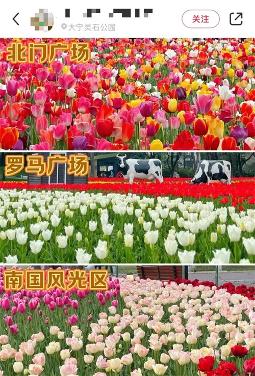 今年大宁公园郁金香,主要分布在园内罗马广场、北门广场和南国风光三处标志性景点。