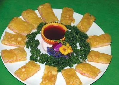原料:虾胶250克、腐皮2张、西杏片50克、泰国鸡汁100克
