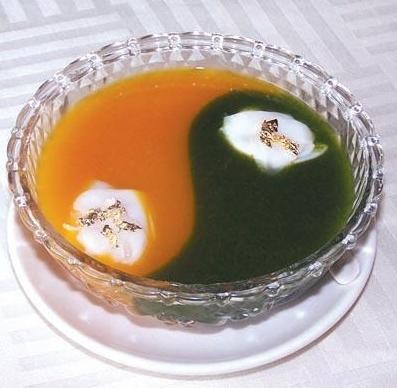 制作 1、先把乌鱼蛋用清水洗一洗,剥去脂皮,放在凉水锅里,在旺火上烧开后,端下锅浸泡6小时,然后把乌鱼蛋一片片地揭开,放进凉水锅中,在旺火上烧到八成开时,换成凉水再烧,如此反复五六次,以祛掉其咸腥味。2、菠菜洗净,入沸水中大火汆2分钟,捞出控水,放入搅拌机内,加入200克清汤搅拌成蓉;番瓜去皮,切大块,上笼大火蒸30分钟,取出放入搅拌机内,加200克清汤搅打成蓉。3、锅内放入300克高汤、菠菜蓉、一半乌鱼蛋小火烧开,用5克盐、5克味精、2.5克绍酒、1.5克胡椒粉小火烧开,用10克湿淀粉勾芡,出锅备用;番瓜采用同样的处理方法。4、将调好的菠菜蓉乌鱼蛋和番瓜蓉乌鱼蛋按照太极的形式放入盅内,撒金箔上桌。