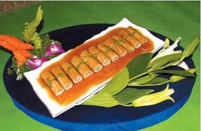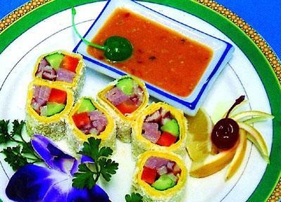 原料:北极贝、熟火鸡肉、黄瓜、泡红萝卜(市场有售)、椰蓉各50克,煎好的蛋皮3张,香芹、兰花、橙子片、樱桃各2克。调料:卡夫奇妙酱、鸡汤、果仁碎(品种可任选)各50克,香油5克,泰国辣鸡酱100克,盐10克,红油10克。制作:1、北极贝、熟火鸡肉分别切长4厘米的丝,黄瓜、泡红萝卜均切0.5厘米见方、长4厘米的条。2、北极贝丝、熟火鸡肉丝、黄瓜条、泡红萝卜条分三等份码放整齐,放在铺好的蛋皮上,从一端卷起成卷;将卷好的蛋卷抹匀卡夫奇妙酱,蘸匀椰蓉后一切为二装入盘中,用香芹、兰花、橙子片、樱桃点缀。3、泰国辣鸡酱、果仁碎、盐、鸡汤、红油、香油调匀成香辣回味汁,与蛋卷一同上桌蘸食即可。特点:造型美观,口味新颖。