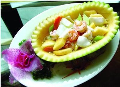 原料:哈密瓜1个(约750克),发好虾仁500克,花枝片(即鱿鱼片)250克,西芹段300克,红椒片50克。调料:精盐5克,味精3克,鸡粉5克,色拉油750克,淀粉芡5克,明油10克。制作:1、哈密瓜洗净,用刀将哈密瓜对半切开,将切口四周修成波浪形花纹,然后挖出哈密瓜肉改成小菱形状,皮留用。2、锅放上火,下色拉油烧到五成热,分别下入虾仁、西芹段、花枝片小火滑0.5分钟至熟透。3、锅上火,加入色拉油10克烧至七成热,放入虾仁、西芹段、花枝片、红椒片煸炒1分钟至透,加入哈密瓜肉,翻炒均匀,放入精盐、味精、鸡粉调味,勾淀粉芡,淋明油,出锅装入哈密瓜中即可。特点:海鲜中有水果香味。