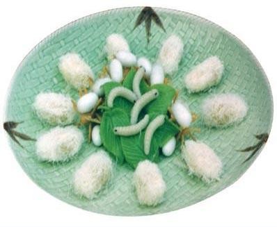 制作 1、蚕蛹洗净;锅内放入色拉油20克,烧至七成热时放入葱段、姜片煸香,入蚕蛹、清汤小火煨10分钟至入味,取出蚕蛹,斩成蓉;威化纸剪成细丝。2、马蹄肉、韭菜、大头菜分别斩成蓉,与墨鱼胶、盐、味精、胡椒粉、白糖调匀呈椭圆形,酿入蚕蛹,粘上威化纸丝,入烧至六成热的色拉油中小火浸炸3分钟至熟,取出控油,装入盘中即可。将芋头雕刻成蚕的形状与菜叶放入盘中做为装饰。