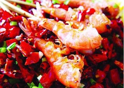 原料:基围虾250克,竹签子25根。调料:干辣椒段150克,老干妈风味豆豉30克,鸡精15克,王守义麻辣鲜、盐各10克,姜片、葱段、蒜片各20克,料酒5克,色拉油1千克。制作:1、基围虾去头、去虾线,用竹签子串成串,加盐、鸡精、料酒腌渍15分钟。2、锅入色拉油,烧至八成热时入虾串中火浸炸2分钟至酥,捞出控油。3、锅内留油30克,烧至七成热时放入葱段、姜片、蒜片小火煸香,入老干妈风味豆豉、干辣椒段中火煸炒1分钟,放入炸好的虾、麻辣鲜粉小火翻匀,出锅装入盘中即可。特点:口味香辣,风味可口。