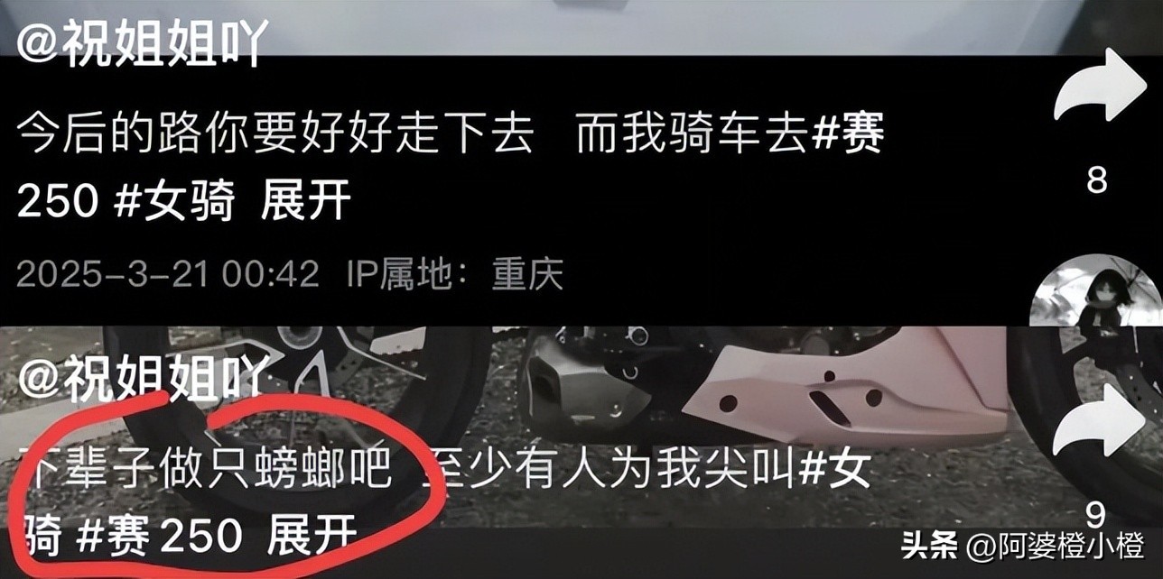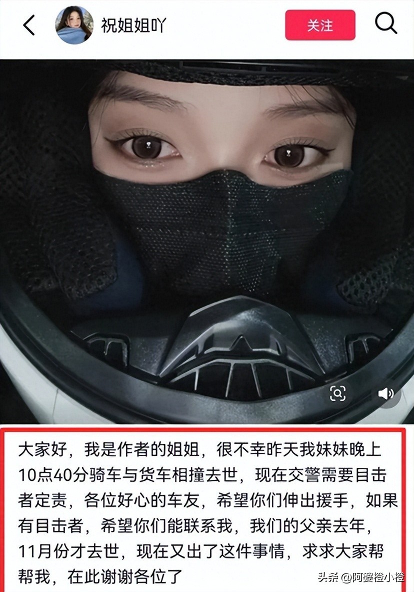 比健身博主马章浩还要小两岁的网红“祝姐姐吖”的意外也十分可惜,3月5日是她在社交平台上发布的第一条机车视频,画面里她戴着猫耳头盔,笑眼弯弯地跨上粉色摩托上。