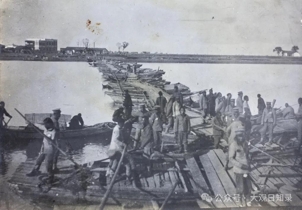 清军搭建起浮桥,横跨汉口与汉阳之间的汉江。远处有烟囱的是汉阳铁厂,后面是龟山。
