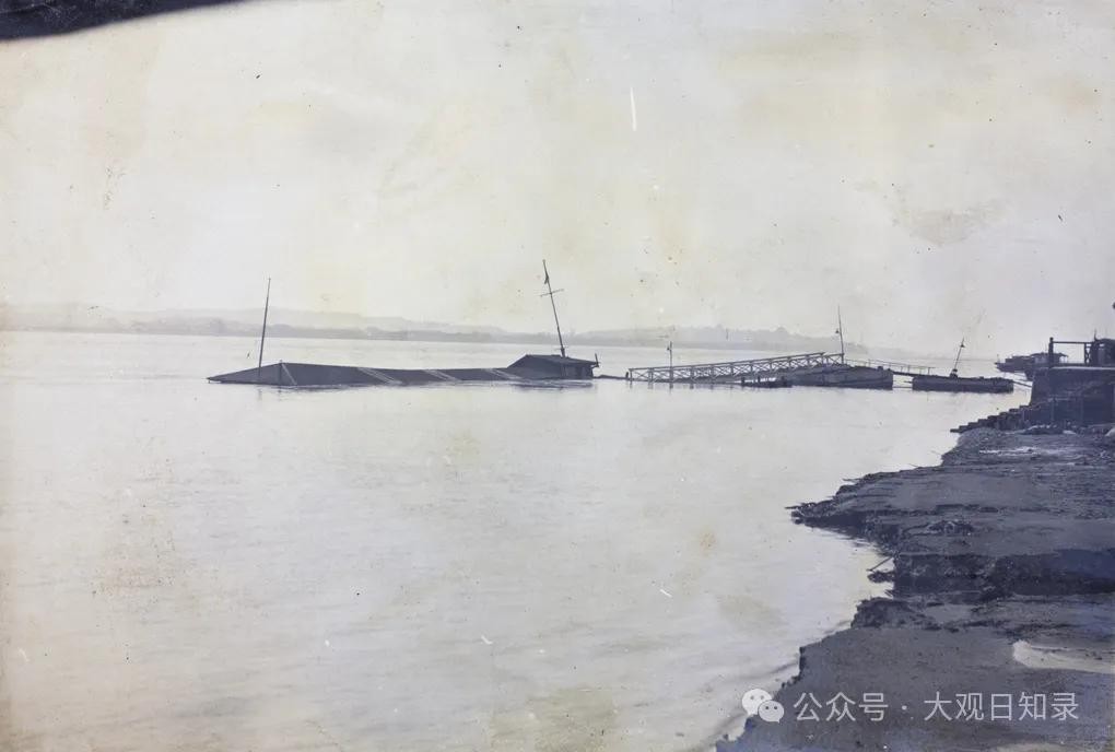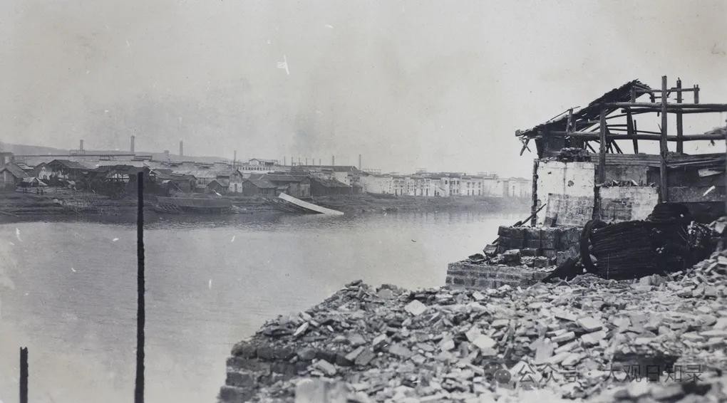 汉口江岸边,右边是的建筑似乎是汉口海关。远处有被炮火击中后搁浅的废船。