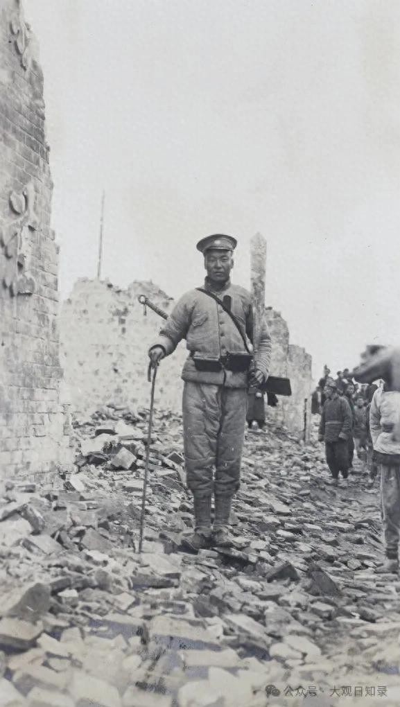 一名清军军官站在瓦砾中,左手托着的是令牌?