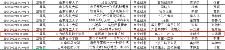 山东省大学生创业大赛是由山东省科学技术协会、山东省教育厅主办,山东大学承办的创业大赛,在山东力明科技职业学院董事长王力一教授的高度重视和大力支持下,学院科协密切组织、精心策划,由科协宋海鹰指导的中医养生健身俱乐部项目在全省一百多所高校中斩获三等奖,实现了该项目历史性突破,大赛获奖全省高职院校仅8所,山东力明科技职业学院是山东省唯一一所获奖民办高校、泰安市唯一一所高职院校。