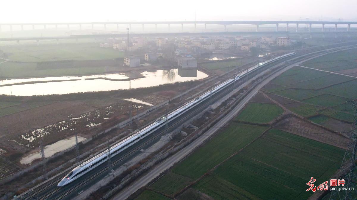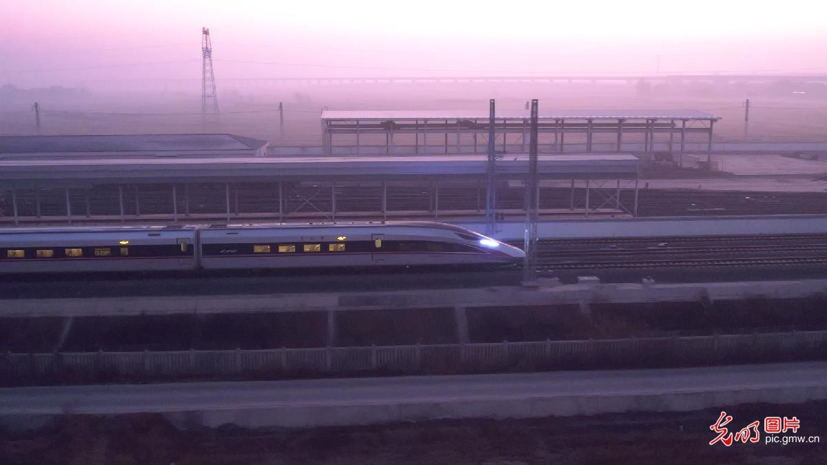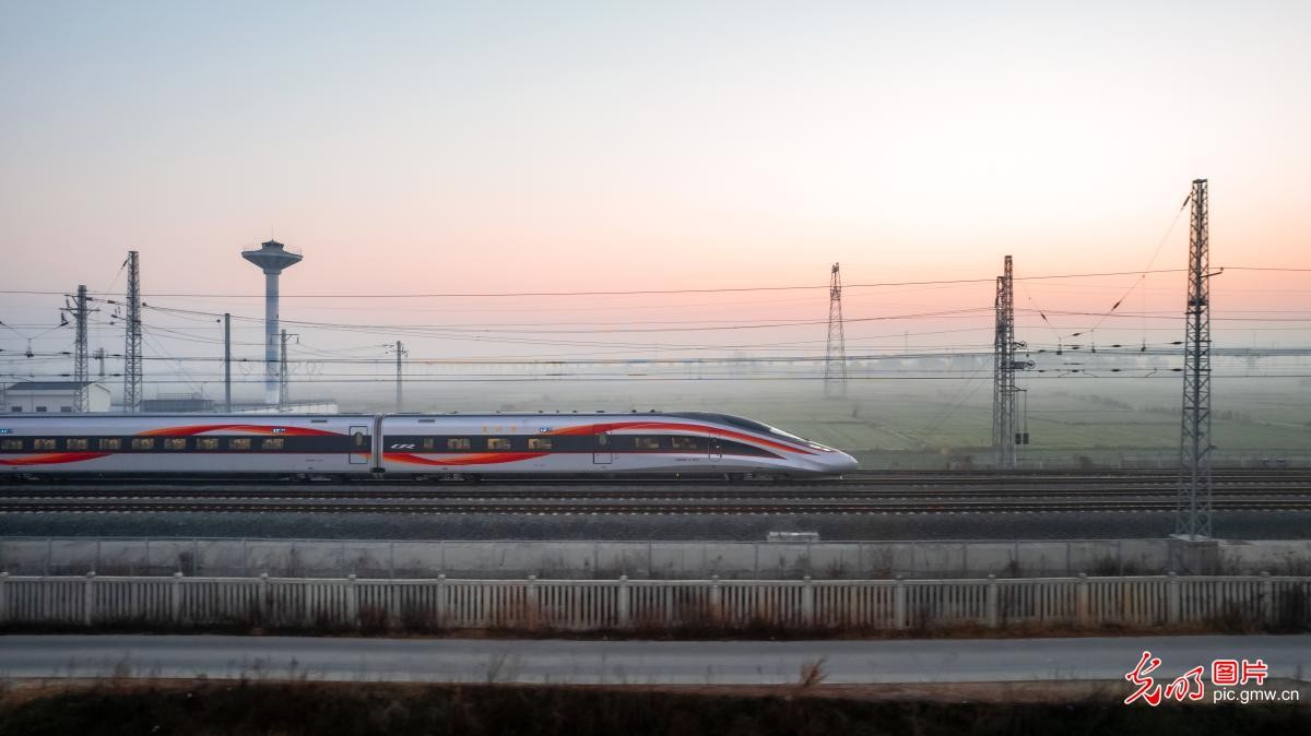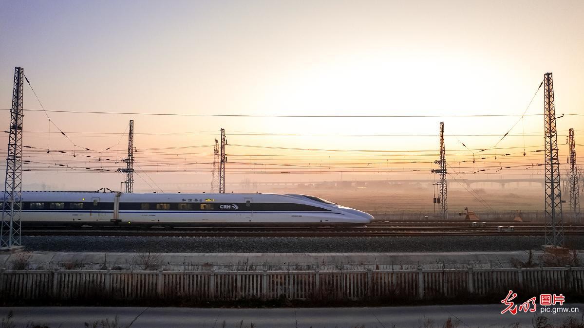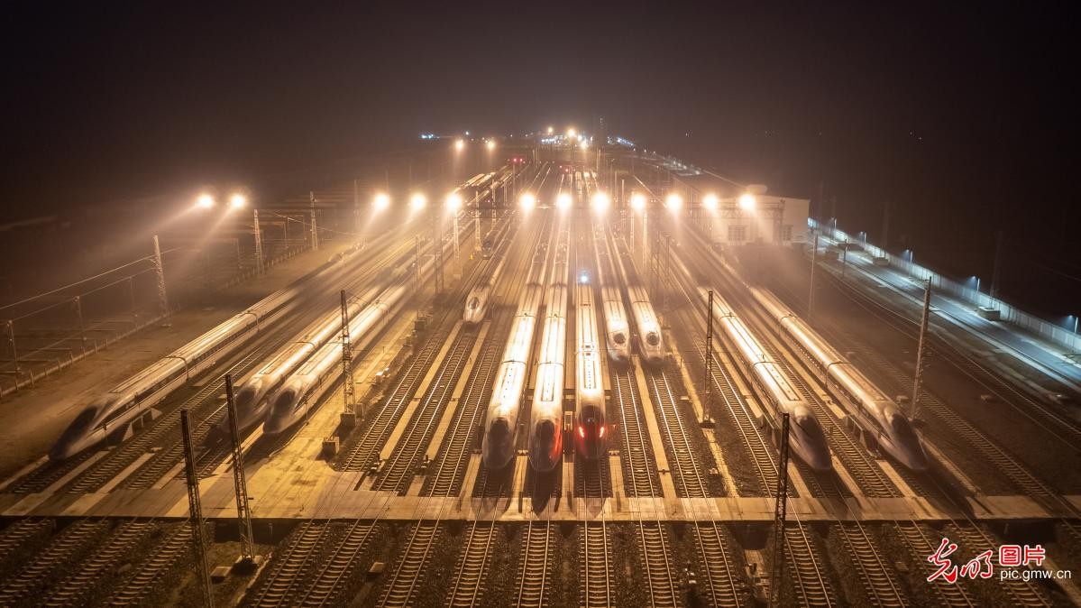 2023年1月7日,为期40天的春运大幕正式开启。铁路部门积极应对客流,合理组织运力。图为郑渝高铁2023春运首列复兴号智能动车组出库开往襄阳东站。(袁辉摄/光明图片)