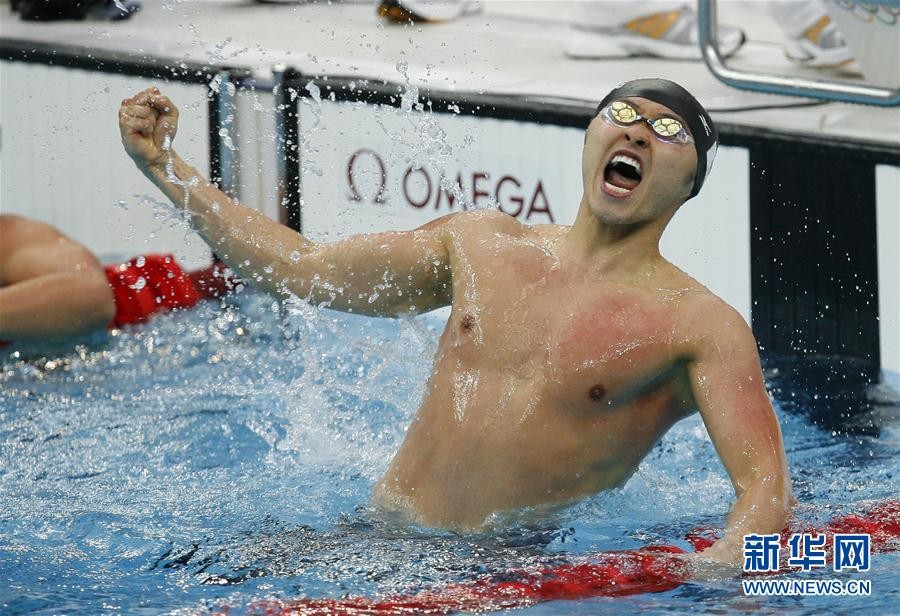 图为2008年8月11日,日本选手北岛康介在北京奥运会游泳项目男子100米蛙泳决赛后庆祝胜利,他以58秒91的成绩打破世界纪录,并获得冠军。新华社发