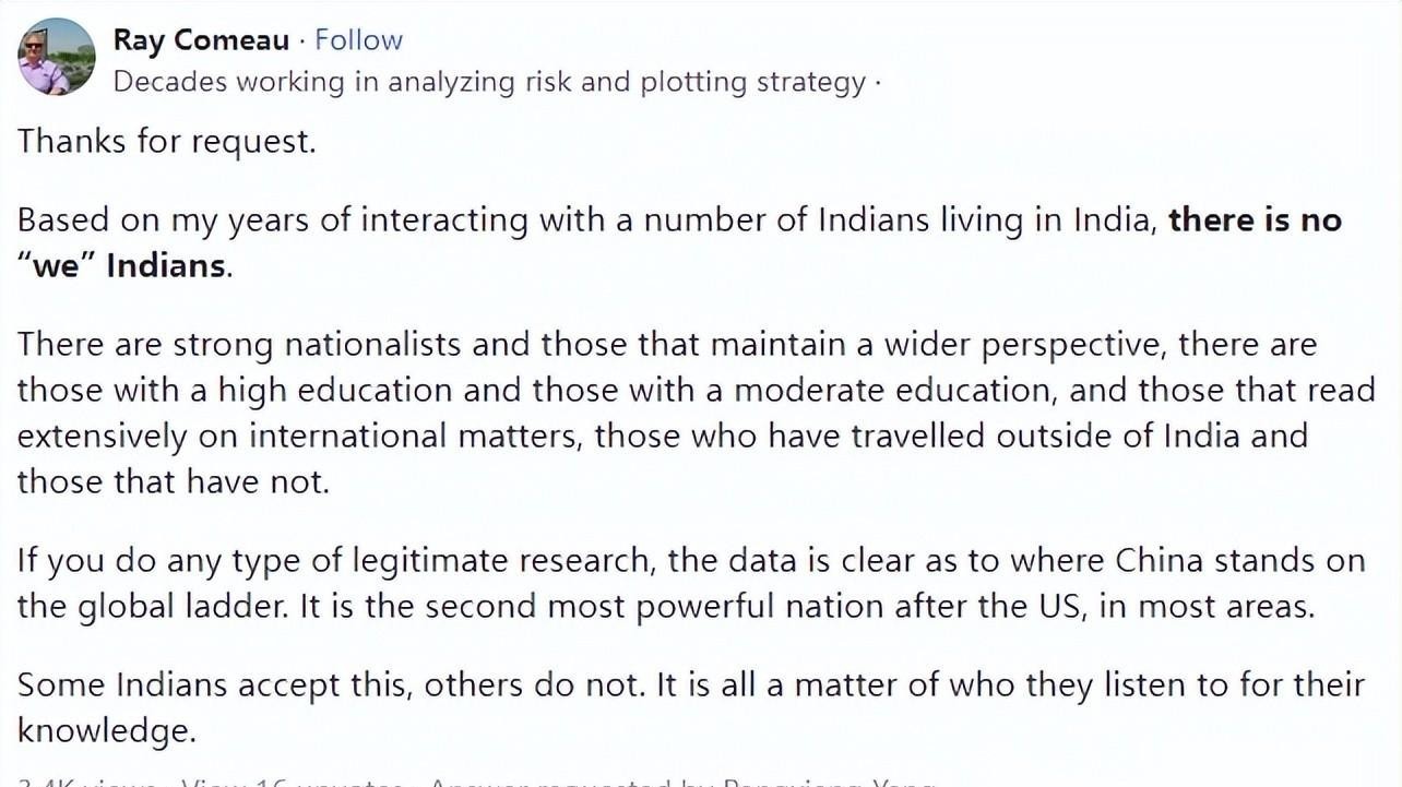 最后我得提一个外国网友的见解——他挺中肯的指出:印度群体里意见确实不统一。有人愿意接受现实中的多样性和复杂性;另一部分则可能更愿意沉浸在某种盲目民族主义之中。