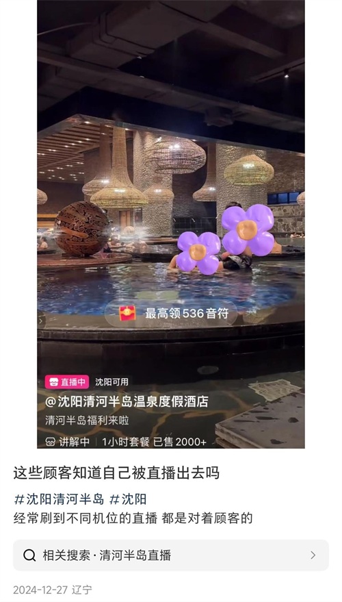 网友发布的帖文显示,位于沈阳市的清河半岛温泉度假酒店直播时拍摄了酒店的室内泳池,泳池顾客的一举一动都暴露在镜头下,评论区偶尔还有留言对顾客评头论足。记者注意到,这不是第一次有人发帖表达对酒店直播室内泳池的不适,评论区也有人表示,如果酒店是在顾客不知情的情况下直播,担忧侵犯顾客隐私。