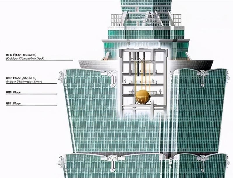 台北101大厦的风阻尼器从92层吊下来,像钟摆一样抵消台风的风力,用巨大的涂压式活塞紧紧系在大楼结构上。