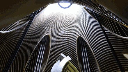 一旦大楼移动,阻尼器也跟着动,只不过方向相反,就靠这股抵抗力缓和风势,活塞让阻尼器不会过度摆荡。它可以把风势造成的大楼摇摆降低至少三分之一,24小时运转工作。