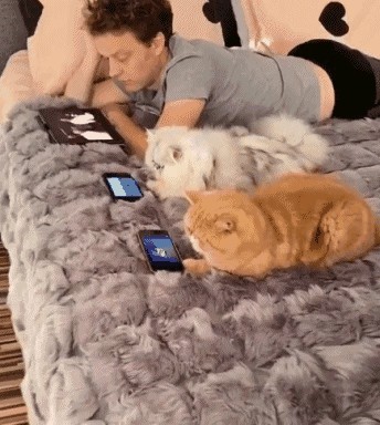 一人一个,互相不打扰,主打的就是公平。话说这时候要是抢走了猫咪的手机会怎样?