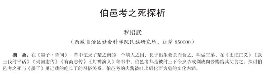 根据西藏社科院的罗邵武老师论文《伯邑考之死探析》,他认为在古代,有个习俗,叫做杀长子以宜弟,在《墨子·节葬下》、《列子·汤问》、《后汉书·南蛮传》中均有此记载。这种习俗一般而言,被杀的都是长子,都是解而食之,都认为有宜弟(对弟弟有帮助)的作用。咱们把伯邑考放在这个习俗里看一下,伯邑考是长子,后来被剁成肉酱做成了肉饼给姬昌吃,死后还化作了一只小兔子,伯邑考之死,对周武王姬发有很大好处。简单地说,就是在当时的社会环境和社会习俗之中,存在着食长宜弟的风俗传统。