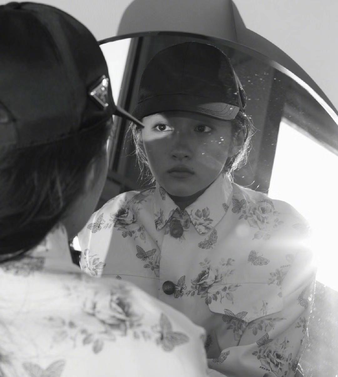 关晓彤个子高,但是脸小,五官算不上很精致。她的面容不适合演傻白甜,她这长相其实更适合演叛逆少女和班上欺凌其他人的坏学生。在这样黑白色调的滤镜下,关晓彤身穿白色印花衬衫,头戴鸭舌帽,眼神犀利,对着镜子仿佛有什么心事一般。