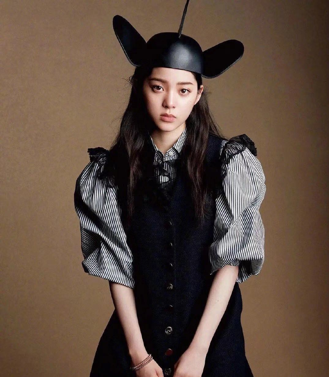 这样一来,早前欧阳娜娜的一套造型也被扒了出来,大家同样都拍摄了瓜皮帽造型的大片。图中欧阳娜娜梳着黑色的波浪卷发,身穿黑白泡泡袖衬衫以及黑色针织马甲,与此不同的是,欧阳娜娜的帽子是黑色的,这么看来,欧阳娜娜的这番打扮要比关晓彤多出一番少女感,虽然看出来她也在发呆,但是她的眼神里更多表现出的是慵懒感。